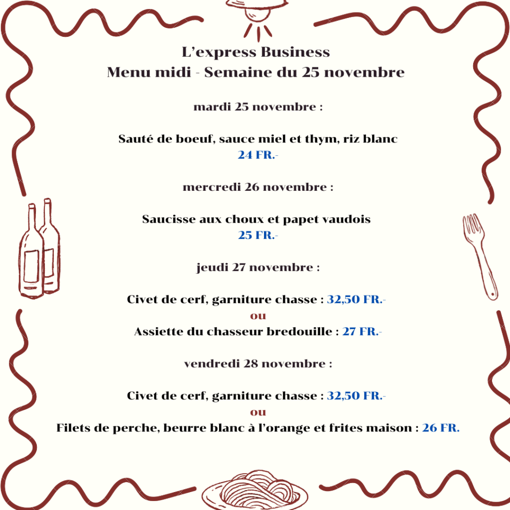 Découvrez la Brasserie Les Trois Rois, votre destination incontournable à Lausanne à l’ambiance familiale et au décor inspiré des bistrots de Paris. Situés au cœur de la ville, nous vous accueillons dans une ambiance chaleureuse rappelant les brasseries parisiennes. Découvrez nos plats faits maison (frites maison, os à moelle en persillade, beignets de Vinzel au Gruyère AOP, l’incontournable fondue vigneronne, l’entrecôte « Château » (faux-filet), notre émincé de veau à la zurichoise) élaborés à partir de produits locaux, et accompagnez-les de notre sélection de vins suisses et français et de digestifs. Que ce soit pour un déjeuner d’affaires, un dîner romantique ou une soirée entre amis, réservez votre table dès aujourd’hui et vivez une expérience culinaire unique.